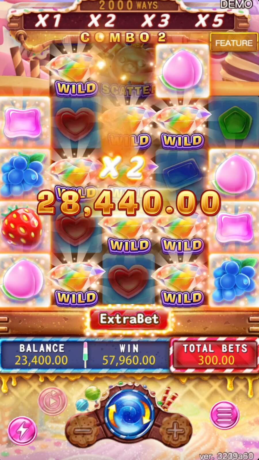 - Extra Bet: +50% bet cost, doble ang ways to win (2,048) at tumataas ang scatter trigger chance.
